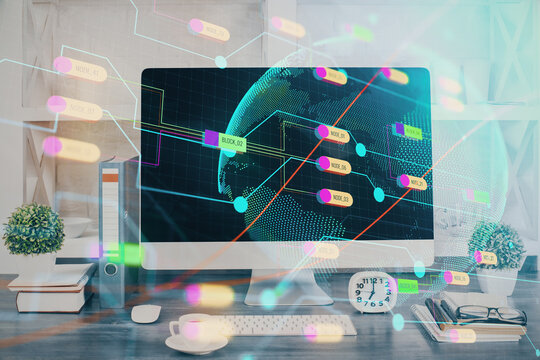 Double exposure of abstract digital world map hologram with connections on San Francisco office buildings background, big data and blockchain concept