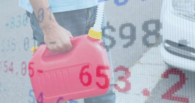 Image of financial data processing over man carrying canister with fuel