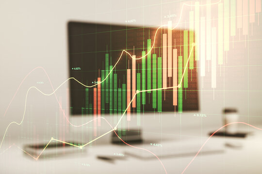 Multi exposure of abstract creative financial graph and modern desktop with computer on background, forex and investment concept