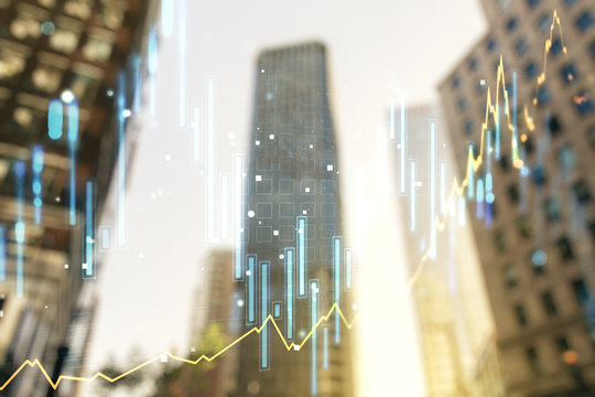Multi exposure of abstract financial graph on office buildings background, forex and investment concept