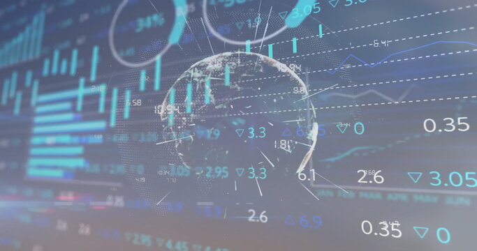 Image of globe, processing circle, lights, graphs and financial data on digital screen