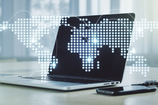 Abstract creative world map with connections on modern laptop background, international trading concept. Multiexposure