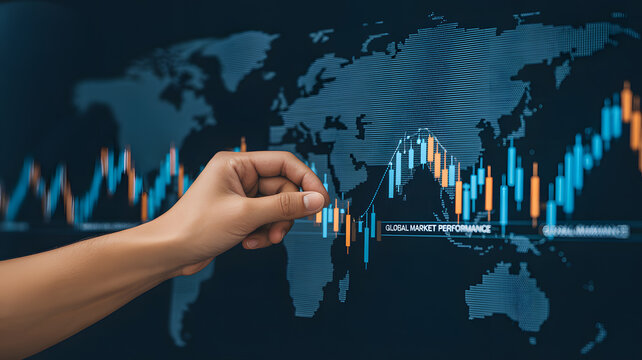 Global market analysis: A focused composition shows a hand interacting with a world map overlayed with intricate data charts, portraying global market analysis.