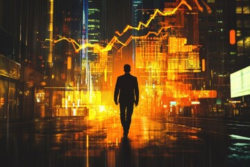 A lone businessman walks through a futuristic city at night, illuminated by glowing data streams and stock market graphs.