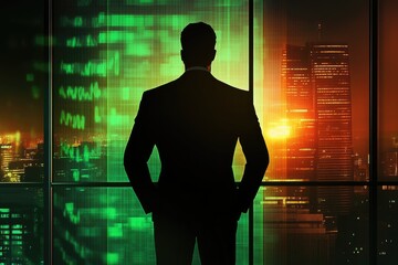 Silhouette of a businessman looking at a cityscape through a window displaying data streams.