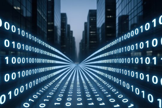 Digital Data Stream Flowing Through Cityscape, Representing Connectivity, Data Transfer, and Modern Technology