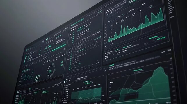 Businesswoman reviewing financial data on a large interactive display, analyzing market trends and insights.