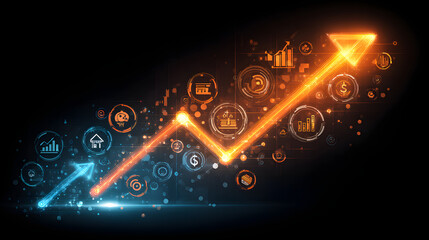 Digital representation of financial growth and progress visualized with glowing arrows ascending upward against a dark background, highlighting business success with a modern, abstract design,...