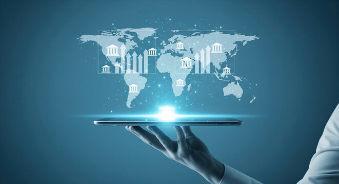 Hand tablet world map digital technology finance banking growth futuristic blue Digital tablet held by hand with glowing world map financial icons and upward arrows representing global banking