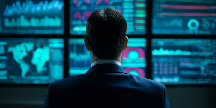 Man in suit viewing multiple screens displaying financial data and world map, representing global market analysis and data monitoring