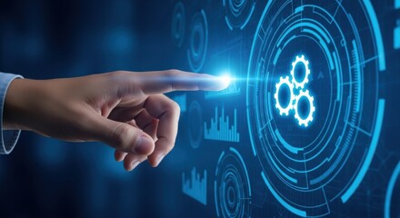 Human hand touching a futuristic digital interface with glowing gears and data streams, representing technology and innovation