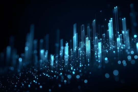 A dark blue background with glowing data visualization graphics of graphs and charts. The focus is on the holographic appearance of digital bar graphs,