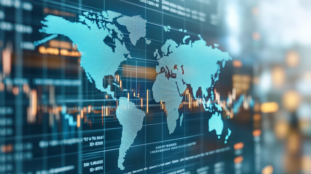 Financial data overlay on world map indicating global trends