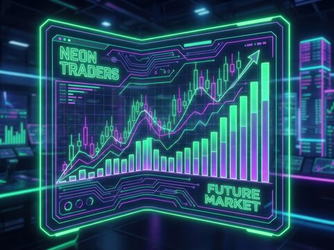 Futuristic neon display showcasing financial data, charts, and market trends with vibrant colors.