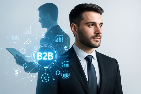 Business professional with B2B digital interface and data icons in futuristic style on abstract background representing corporate innovation concept. Ai generative