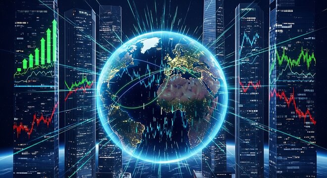 Global stock market data visualization with futuristic elements