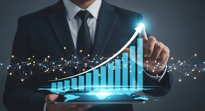 Digital bar chart showing upward trend with glowing arrow against a dark background featuring a blue holographic world map and data visualization