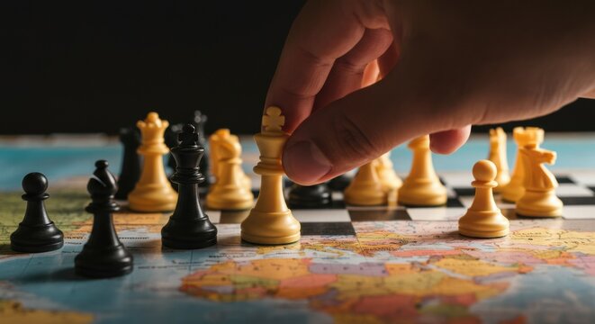 Hand moving chess piece on world map conveying global strategy and planning