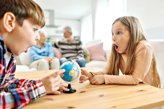 child girl boy education globe earth school map childhood kid brother sister game classroom learning global geography travel excited happy surprise