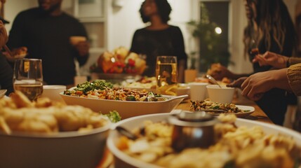 A modern Thanksgiving celebration in an urban apartment, with friends gathered around a table set with a mix of contemporary and traditional decor, enjoying a variety of global dishes