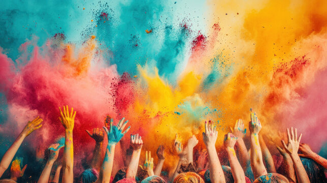 A vibrant scene of Holi festival with people throwing colorful powder in celebration