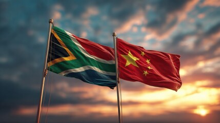 Flags of South Africa and China wave together at sunset in a symbolic display of friendship and cooperation between nations