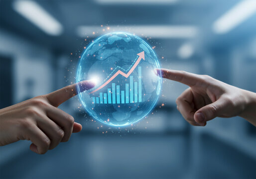 A dark blue background with glowing data visualization graphics of graphs and charts. The focus is on the holographic appearance of digital bar graphs,