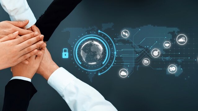 This image depicts diverse hands joining together, symbolizing teamwork in a global network focused on security. The digital elements emphasize cooperation. Raster