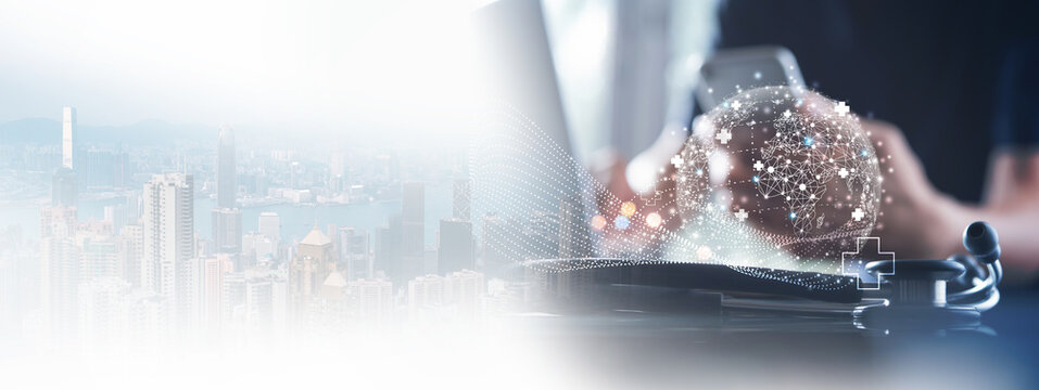 Global health network, virtual hospital, medical technology concept, Doctor using modern computer with global internet network, digital healthcare, telemedicine, electronic medical record system
