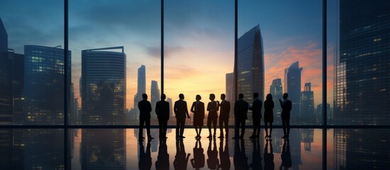 business partnership agreement ideas concept group of silhouette business teamwork standing together with background of downtown urban city office building background multi exposure