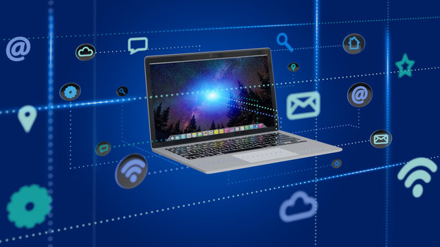 Computer surrounding by app and social icon - 3d render
