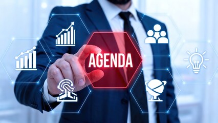 Business professional interacts with digital agenda interface featuring icons for growth, collaboration, innovation, and global connectivity.