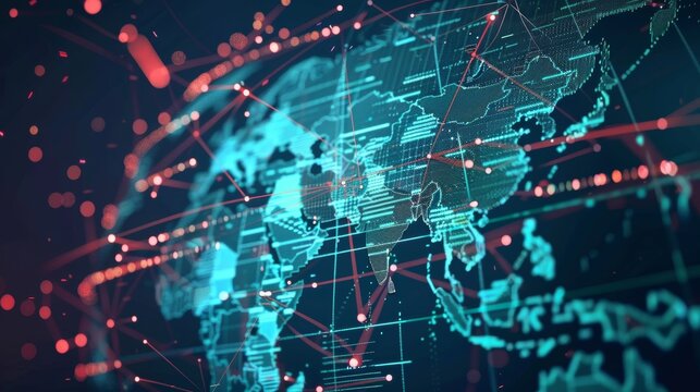 Global business compliance concept graphic interface shows worldwide connections, data flow. International standards, regulations displayed on digital map. Illustrates tech policy planning strategy