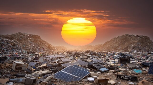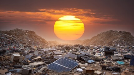 Sunset Over Trash Landfill Highlighting Environmental Challenges and the Need for Sustainable Waste Management Solutions in Urban Areas