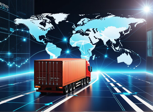 High-tech logistics truck on a digital map background, representing global supply chain and connectivity