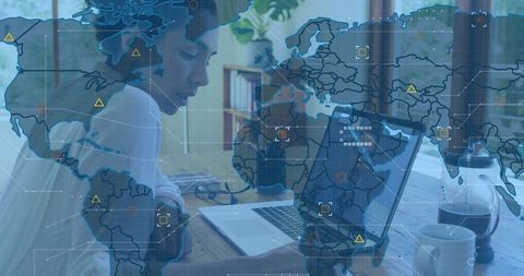 Hands typing on laptop with logistics and delivery icons overlay, modern digital style, blurred office background, concept of global transportation management