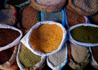 Various Range Of Seeds Stored In Bags At Pondicherry Market, India