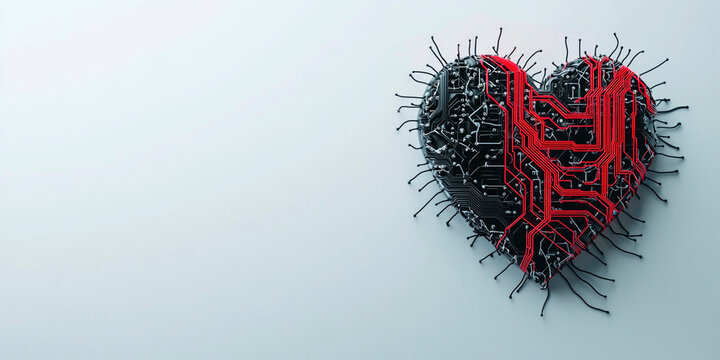 Heart network, representing digital connections with interconnected circuits and nodes, symbolizing global communication betwen human and technology. White Background.