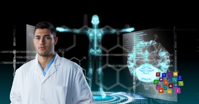 Composition on male doctor over screen with digital human skeleton and medical data processing