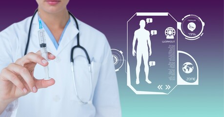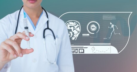 Composition of female doctor holding syringe with medical data processing