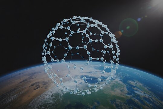 Futuristic molecular network orbits Earth, symbolizing global innovation and advanced technology.
