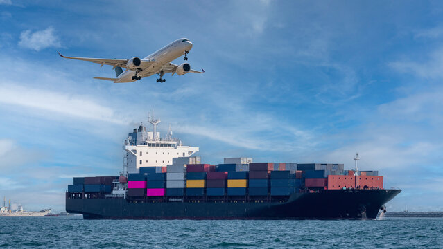 Cargo shipping containers through calm ocean capacity of maritime logistics to move goods worldwide commercial airplane modern global commerce transport before reaching their final destination.