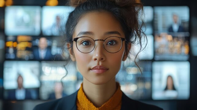 A recruiter interviewing a candidate from another country via video call, with a modern office setup in the background