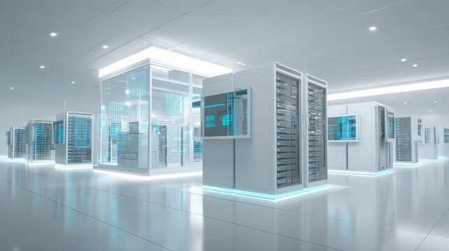 Powerful servers processing big data in a modern data center, glowing with blue light, ensuring high performance and reliability for cloud computing and information technology