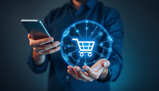 E-commerce technology concept with businessman holding smartphone and virtual digital icons