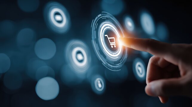 A finger touching a digital shopping cart icon on a futuristic interface with bokeh background lights
