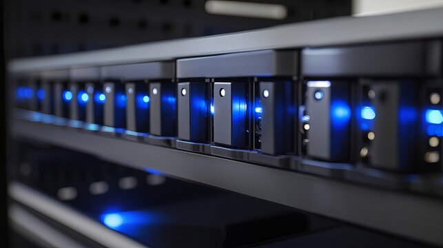 Modern Data Center Server Rack Powerful Technology Blue Lights Illuminated Network Storage High Performance Computing Infrastructure Digital