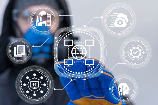 Worker using virtual touch screen push icon: global computer network. Industry networking information technology concept. Industrial data AI storage.