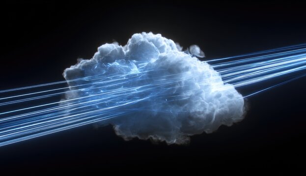 A vibrant visual of cloud computing, with glowing cloud icons, representing a network of digital data transfer.