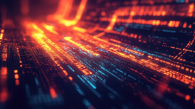 Abstract visual representing high speed digital data transfer and information flow along glowing orange and blue circuits, symbolizing modern technology and network communication